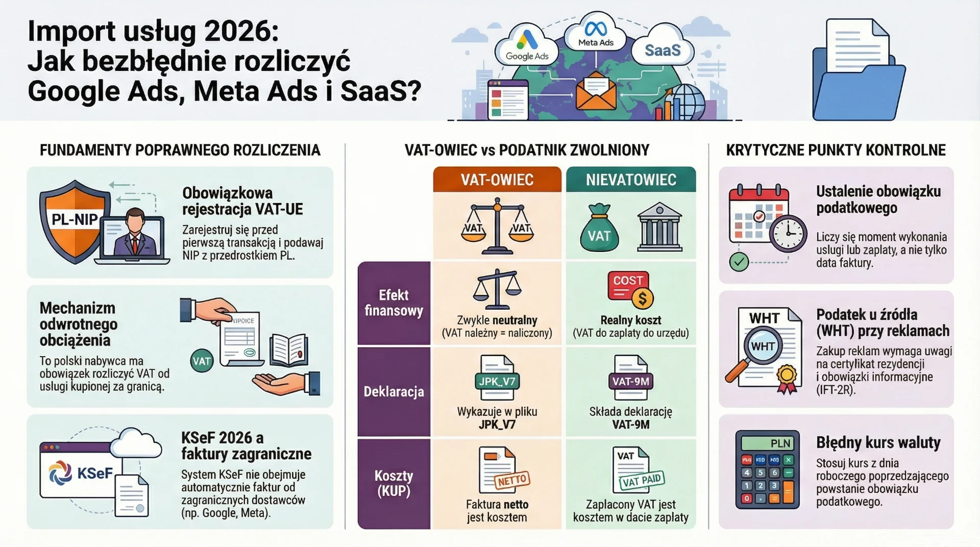 Ten artykuł dotyczy właśnie najczęstszego scenariusza: polski przedsiębiorca kupuje usługę od zagranicznego kontrahenta na potrzeby firmy. Nie opisuje wszystkich wyjątków i szczególnych przypadków, ale dobrze porządkuje to, co w praktyce dotyczy większości JDG i MŚP kupujących reklamy online, subskrypcje SaaS i usługi cyfrowe z zagranicy.